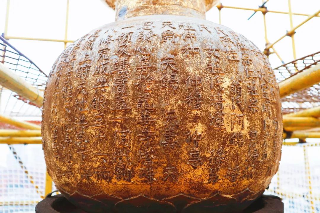 ? ? ? ? 龍華塔是上海地區(qū)保存最完好的宋代樓閣式塔,明人馮遷譽(yù)其為“千年飛塔”。舊時(shí),“秋江塔影”與“龍華晚鐘”同樣蜚聲海內(nèi)外。龍華塔頂端塔剎葫蘆,上一次貼金箔修繕是在1984年,歷經(jīng)時(shí)間和風(fēng)雨的洗禮,斑駁銹蝕,金箔缺損嚴(yán)重。本次保養(yǎng)維護(hù)過(guò)程中,維修人員為塔剎葫蘆重貼金箔,再現(xiàn)璀璨金光。
