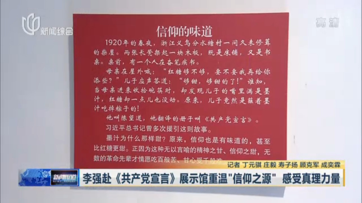 ? ? ? ? 1920年春,陳望道在浙江老家柴房苦譯《共產(chǎn)黨宣言》,曾將墨水誤作紅糖,吃下母親送來(lái)的粽子?!罢褐贼兆樱€說(shuō)味道很甜”。這則被習(xí)近平總書記多次提及的故事“真理的味道”,在展廳中通過(guò)視頻播放。市領(lǐng)導(dǎo)在此駐足凝視,李強(qiáng)表示,在陳望道先生的舊居重溫“信仰之源”,確實(shí)深受觸動(dòng)和啟迪,也感受到強(qiáng)大的真理力量,這對(duì)于我們不忘初心、牢記使命,把新時(shí)代中國(guó)特色社會(huì)主義推向前進(jìn),是一次深刻的教育。從歷史到現(xiàn)實(shí),我們對(duì)馬克思和《共產(chǎn)黨宣言》的最好紀(jì)念,就是把習(xí)近平新時(shí)代中國(guó)特色社會(huì)主義思想這一當(dāng)代中國(guó)馬克思主義研究好、宣傳好、貫徹好。